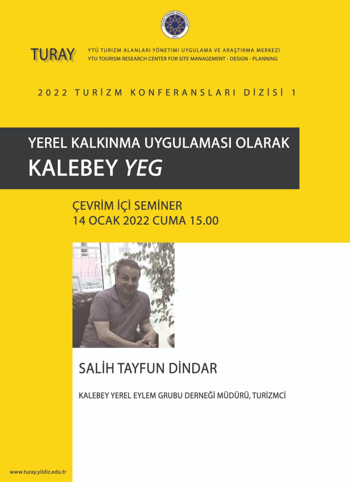Yıldız Teknik Üniversitesi Mimarlık Fakültesi TURAY Turizm Alanları Yönetimi Uygulama ve Araştırma Merkezi ve Kalebey Yeg arasında 14 ocak 2022 tarihinde saat 15.00 de çevrim içi seminer gerçekleştirildi. Seminer Fakülte Öğretim Görevlilerinden Doç.Dr.Selin Yıldız yönetiminde bir zoom toplantısıyla Kalebey Yeg Müdürü Salih Tayfun Dindar’ın sunumu ve soru cevap şeklinde gerçekleşti. S.Tayfun Dindar önce Leader Tedbirleri konusunda genel bilgilendirmeler yaptıktan sonra Kalebey Yerel Eylem Grubu Bölgesini genel tanıtımlarını yaptı ve yeg faaliyetleri ve uygulamaları üzerine bilgi verdi.Özellikle Beyağaç evlerinin mimari yapısının Mimarlık Fakültesi öğretim görevlileri ve öğrencileri tarafından araştırılarak ülkemiz mimarlık literatürüne kazandırılması konusunda yerinde inceleme araştırma yapılması üzerine davetlerde bulunuldu. Bundan böyle karşılıklı olarak özellikle kırsal turizm odaklı ortak projeler üretilmesi konusunda düşünce birliğine varıldı.